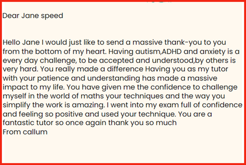 "I would like to send a massive 'thank you' to you from the bottom of my heart. Having autism, anxiety and ADHD is an everyday challenge to be accepted and understood by others. You really made a difference. Having you as my tutor, with your patience and understanding, has made a massive impact to my life. You have given me the confidence to challenge myself in the world of maths. Your techniques and the way you simplify the work is amazing. I went into my exams full of confidence and feeling so positive and used your techniques. You are a fantastic tutor so, once again, thank you so much!"